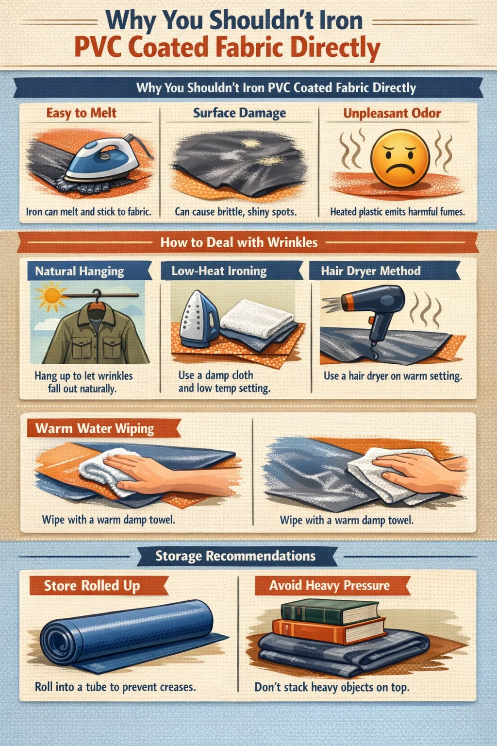 الكي بدرجة حرارة منخفضة باستخدام حاجز من القماش: إذا كان لا بد من استخدام المكواة، فاضبطيها على أدنى درجة حرارة. ضع قطعة قماش قطنية سميكة ورطبة على الجزء الخلفي من القماش المطلي بـ PVC (الجانب بدون الطلاء) كمنطقة عازلة. لا تدع المكواة تلمس القماش بشكل مباشر أبدًا، وحافظ على حركة المكواة باستمرار؛ لا تتركها في مكان واحد أبدًا.