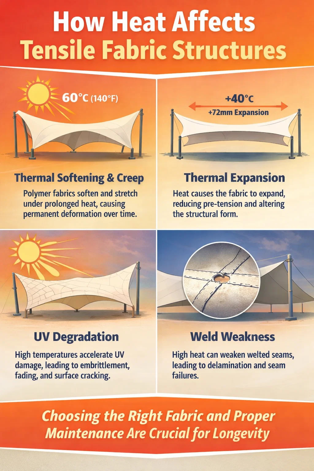 تؤثر الحرارة على نسيج الشد بثلاث طرق مختلفة: فهي تعمل على تليين المادة، وتسريع تدهور الأشعة فوق البنفسجية، وتسبب توسع الأبعاد الذي يغير التوتر المسبق المصمم هندسيًا في الهيكل. يساعدك فهم كل من هذه الآليات على اختيار النسيج المناسب ووضع توقعات صيانة واقعية.