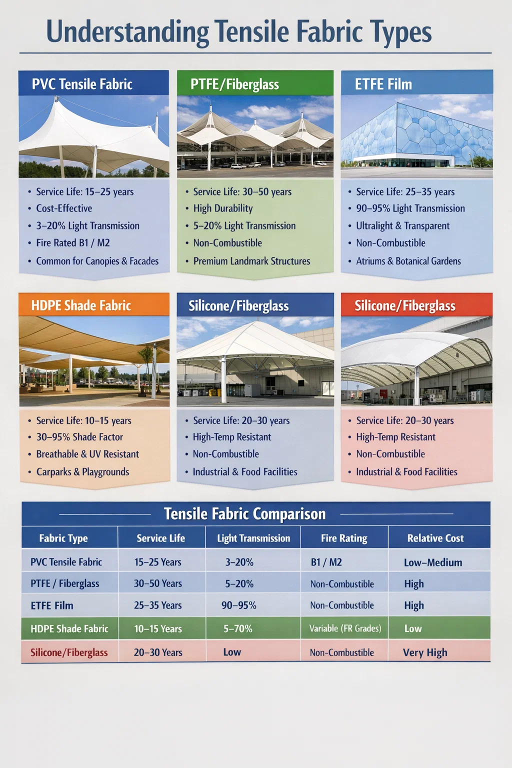 يأتي نسيج الشد في عدة أنواع متميزة، تم تصميم كل منها لتلبية متطلبات أداء محددة. الفئات الرئيسية هي قماش الشد PVC، قماش PTFE (بولي تترافلوروإيثيلين)، فيلم ETFE (إيثيلين رباعي فلورو إيثيلين)، نسيج الظل HDPE، والألياف الزجاجية المطلية بالسيليكون . ومن بين هذه الأقمشة، يهيمن نسيج الشد PVC على السوق العالمية - حيث يمثل ما يقرب من 60 إلى 70% من جميع تركيبات الأغشية المعمارية - نظرًا لفعاليته من حيث التكلفة، ونطاق الألوان الواسع، والأداء الهيكلي الموثوق به عبر المناخات المتنوعة. يعد فهم كل نوع أمرًا ضروريًا قبل الالتزام بأي مشروع هيكلي قابل للشد، سواء كان ذلك مظلة أو سقف استاد أو واجهة غشائية طويلة المدى.