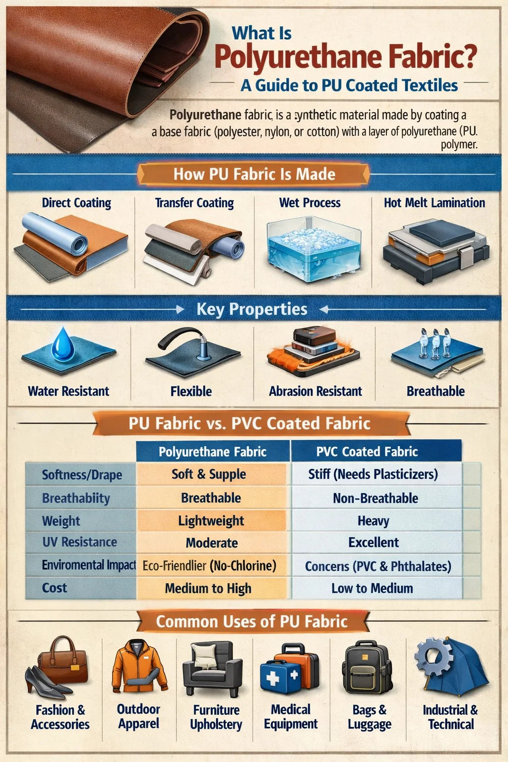نسيج البولي يوريثين عبارة عن مادة نسيجية اصطناعية يتم تصنيعها عن طريق طلاء أو تصفيح القماش الأساسي - عادة البوليستر أو النايلون أو القطن - بطبقة من بوليمر البولي يوريثين (PU). والنتيجة هي مادة تشبه الجلد أو المطاط، ولكنها تظل خفيفة الوزن ومرنة وبأسعار معقولة أكثر بكثير من البدائل الطبيعية. يستخدم على نطاق واسع في الأزياء والمفروشات والملابس الرياضية والعتاد الخارجي والمعدات الطبية والتطبيقات الصناعية.